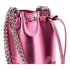 Christian Louboutin’s bright and flashy mini bucket bag is small but mighty with signature logo embroidery winding around the metallic calfskin leather. The chain strap easily adjusts for shoulder or crossbody carry—or remove it and carry the compact statement bag as a party-ready clutch.