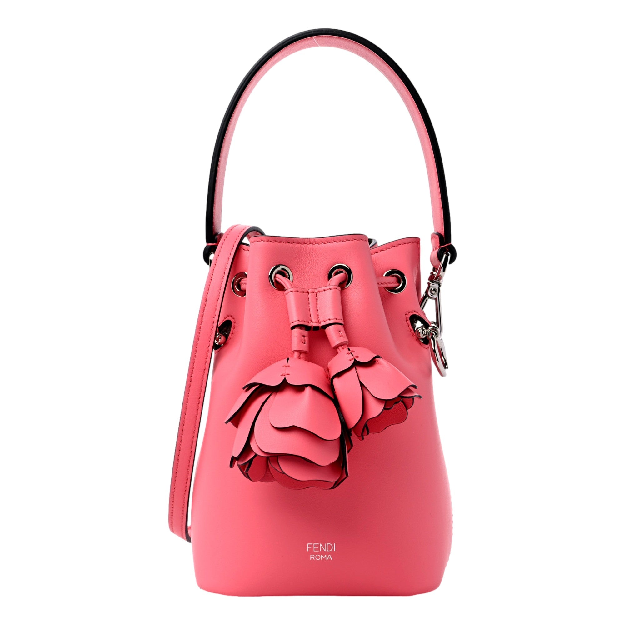 This mini Mon Tresor bucket bag is crafted with Fragola red calfskin leather that features an embossed FF logo throughout. It is finished with a drawstring fastening and metal decorations in the Fendi logo shape. It is conveniently equipped with two detachable straps – one handle and one crossbody. This is an ideal everyday bag with the distinctive style of Fendi!