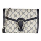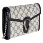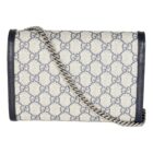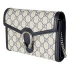 The Gucci Navy GG Supreme Canvas Mini Dionysus Chain Wallet is a chic and compact accessory that seamlessly blends luxury with practicality. Crafted from the brand’s signature GG Supreme canvas, a durable and eco-friendly material, the wallet features the iconic monogram pattern in a rich navy hue, offering a contemporary twist on a classic design.