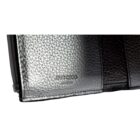 The surface is richly textured with the iconic Jimmy Choo logo, subtly embossed in a monogram motif that evokes a sense of contemporary prestige. Its tri-fold silhouette unfolds to reveal a thoughtfully arranged interior—featuring multiple card slots and a secure snap closure—all tailored for streamlined luxury on the go.
