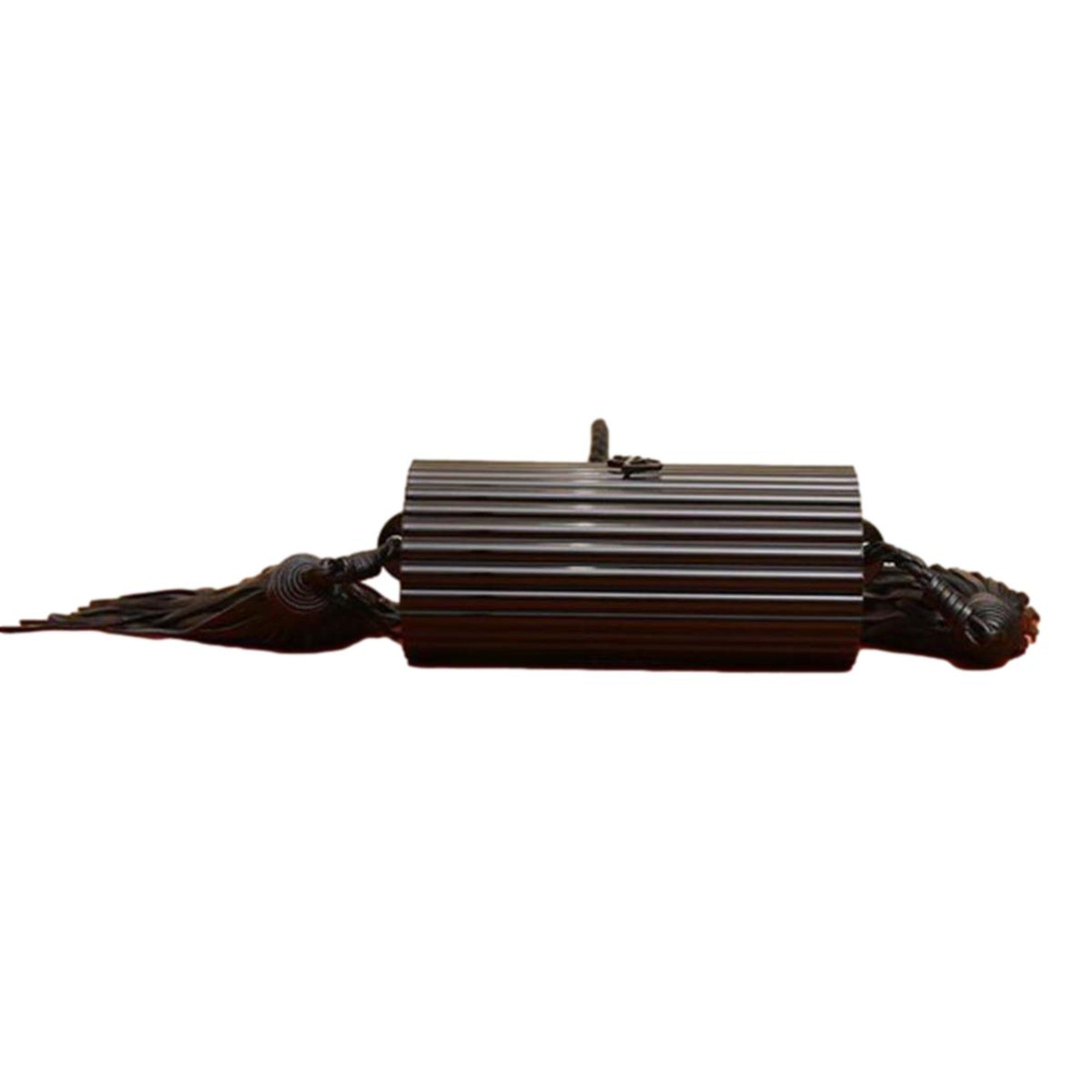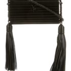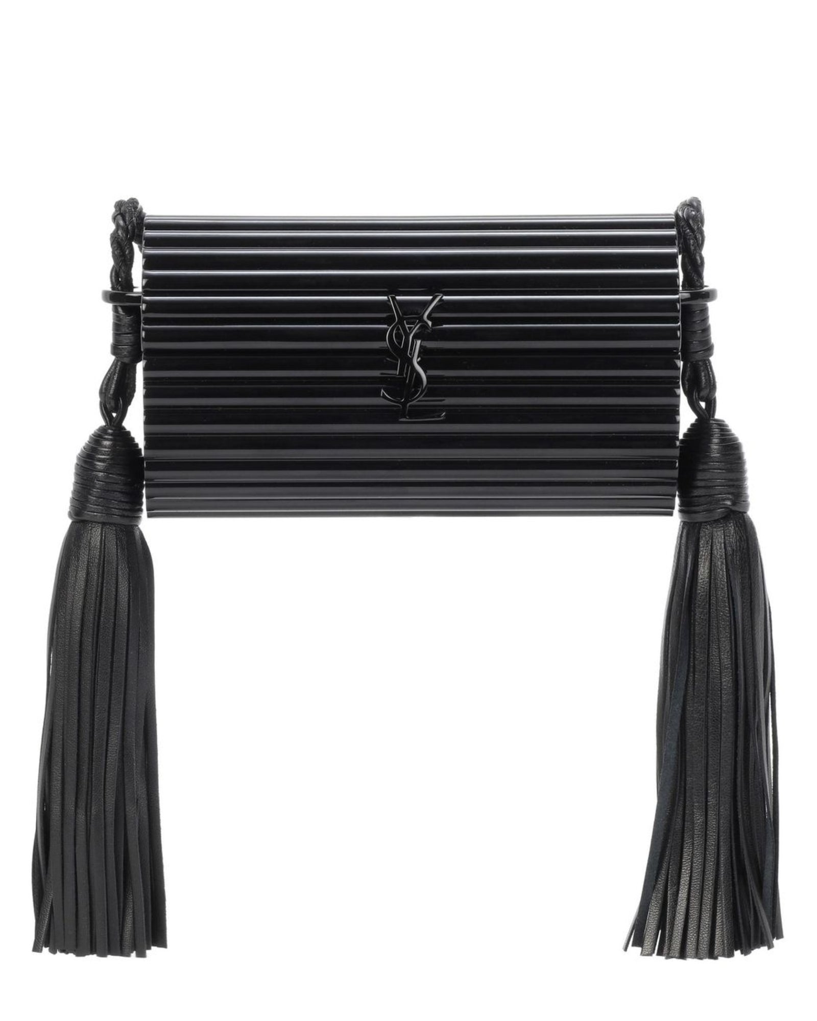 Saint Laurent Black Plexiglass Minaudière Opium Box Bag. Saint Laurent Plexiglass Minaudière Opium Box Bag – Black This bag is made of black ribbed plexiglass with black lambskin leather fringes on each side. Featuring a prominent black YSL monogram logo on the front. The flap opens to a black leather interior. Model 5173900